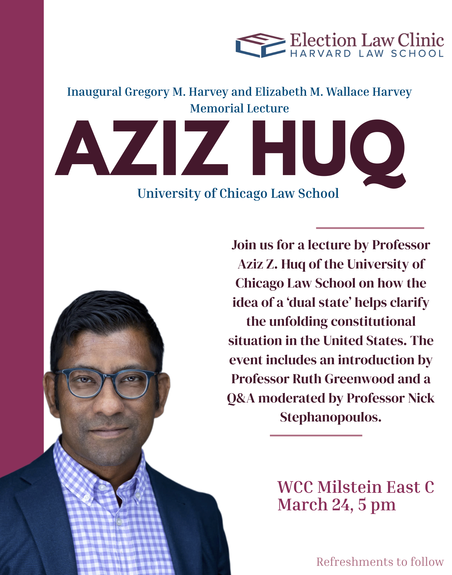 Join us for a lecture by Professor Aziz Z. Huq of the University of Chicago Law School on how the idea of a ‘dual state’ helps clarify the unfolding constitutional situation in the United States. The event includes an introduction by Professor Ruth Greenwood and a Q&A moderated by Professor Nick Stephanopoulos.